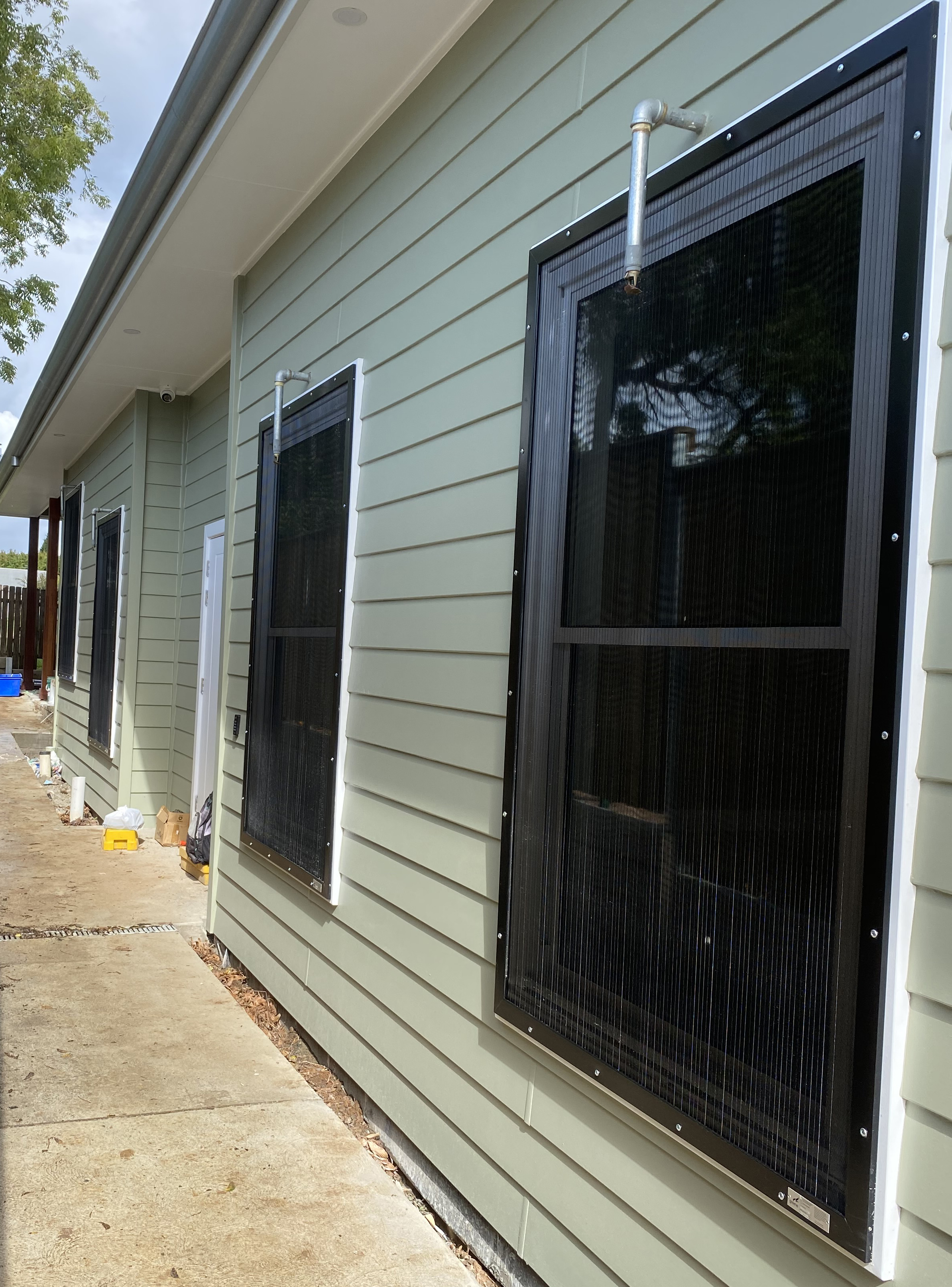 Greene Fire proposed the use of MicroLouvre Attenuation Screens — a precision-engineered, bronze louvre system designed specifically to provide high levels of heat attenuation in bushfire and extreme radiant heat conditions. These screens offered a unique combination of fire resistance, heat shielding, and design flexibility, making them ideally suited to the challenges presented by the Menangle Community Hall project. Unlike traditional barriers, MicroLouvre screens reduce radiant heat transmission by up to 45 percent while maintaining airflow, outward visibility, and natural light. They are capable of withstanding temperatures exceeding 850 degrees Celsius and can be integrated over both fixed and operable window systems. This allowed the design team to preserve the architectural vision of the hall, maintaining openable windows behind the screens and ensuring the building’s ventilation and liveability were not compromised. Each screen was fitted with durable metallic labelling, identifying the product name, manufacturer, installer, and installation date, along with a clear “HEAT ATTENUATION SCREEN – DO NOT REMOVE” warning to support proper maintenance over the building’s lifetime.